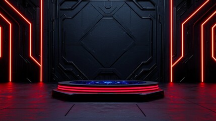 High-tech game show stage featuring futuristic elements and cool neon lighting. A modern game show stage showcasing advanced technology with a futuristic design.