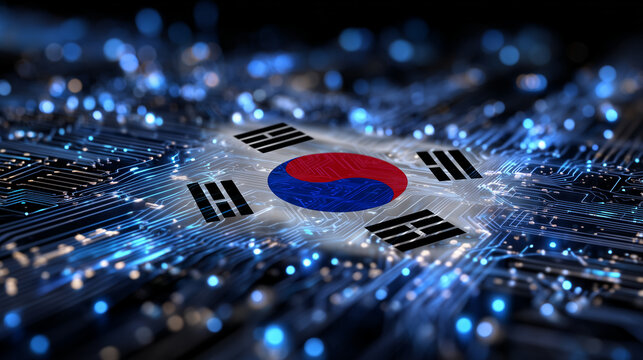 South Korean flag on dark high-tech background, glowing circuitry connecting trigrams, Taeguk illuminated with digital neon glow