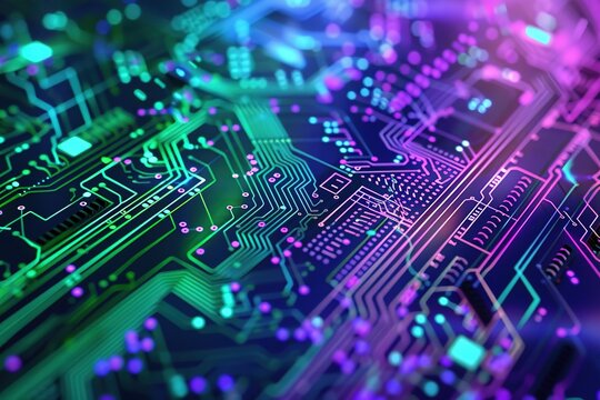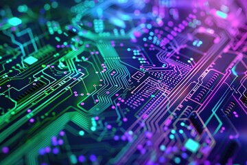 An abstract image of a high-tech circuit board with glowing neon blue and purple lines symbolizing electric currents. The board should fill the entire frame, making a complex, detailed pattern.