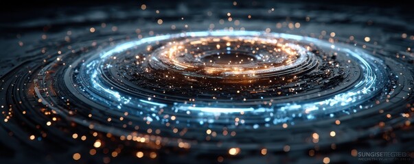 Abstract futuristic technology background: glowing blue circular data stream with algorithmic code