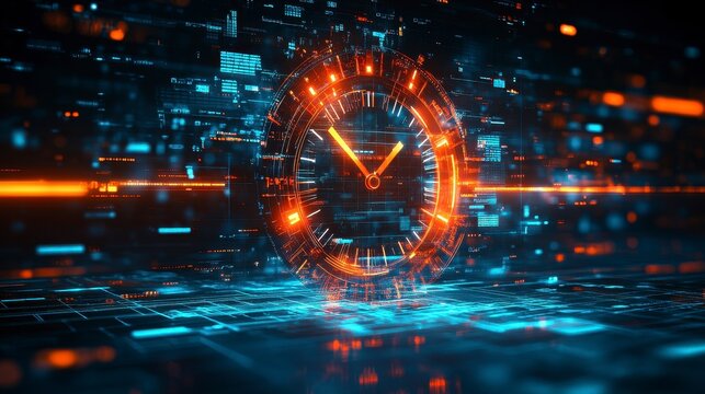 A futuristic clock with digital numbers and glowing lights, surrounded by holographic images of world maps and data streams. The background is dark blue with orange highlights.