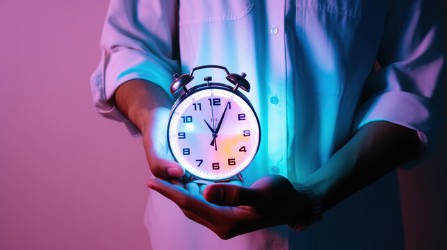 A glowing neon analog clock illustration background.