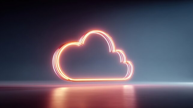 Neon cloud icon with glowing lines and futuristic cityscape background
