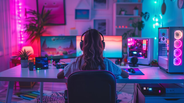 A girl gamer sits at her workplace in a room with neon lighting. The concept of remote work and virtual hobbies.