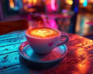 A romantic table setting with latte art in a heart shape illuminated by warm neon lights