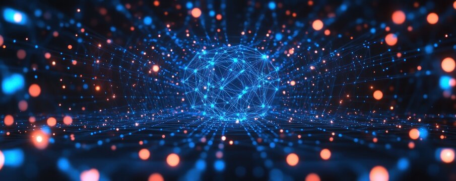 Futuristic glowing blue network sphere surrounded by dynamic orange and blue light particles in a digital tunnel