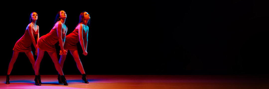 Sensual talented young one in red dresses and heeled shoes dancing against black background in neon light. Concept of modern dance style, creativity, art, hobby. Banner. Empty space to insert text, ad