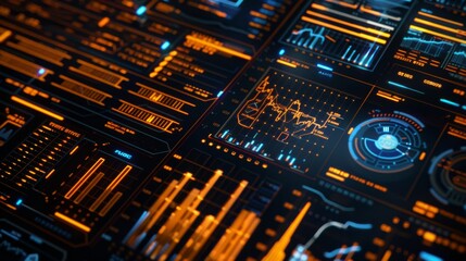 High-tech data dashboard with glowing charts and graphs, illustrating complex digital analytics and data visualization.