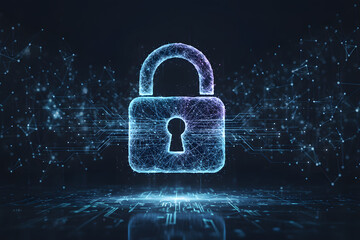 Futuristic glowing padlock made of digital mesh lines, floating over a dark tech background, symbolizing data security and cyber protection