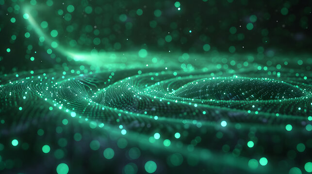 With blur effect and bokeh background, this abstract green energy particles and waves is magical bright and glowing futuristic hi-tech