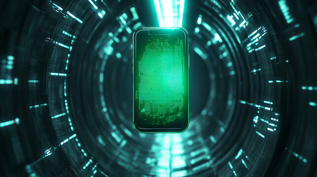 Futuristic smartphone surrounded by glowing digital elements in a high-tech tunnel, showcasing innovation