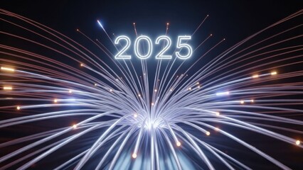 A futuristic, digital fireworks display with the year 2025 in neon lights against a black background.