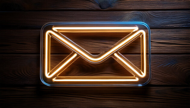 a glowing neon envelope sign on a dark wooden background symbolizing communication and digital messaging