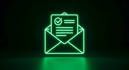 Glowing Green Neon Email Icon with Approved Document Confirmation.