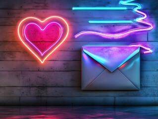 A glowing neon envelope with a heart symbol on a futuristic, cyberpunk-style background, symbolizing love and digital communication.