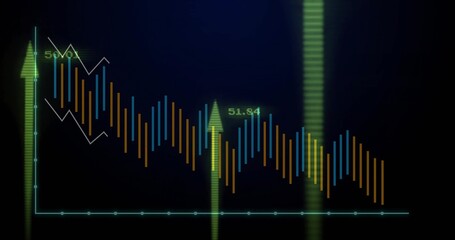 Neon candlestick trading chart with smoothing trendline and numeric data markers