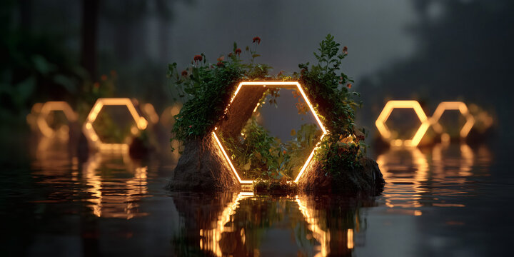 Glowing hexagonal light frames with plants in a misty lake at night, reflections