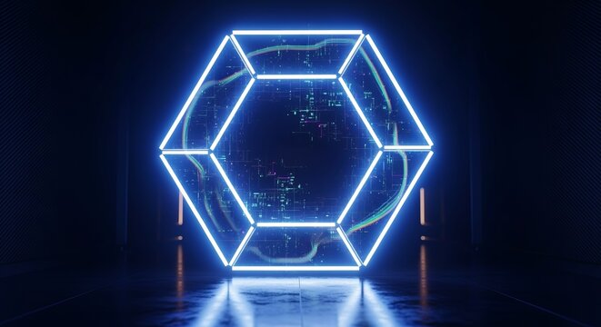 Futuristic neon hexagon portal with glowing lines creating a vibrant, abstract digital pathway. Ideal for technology, gaming, or sci-fi themes.