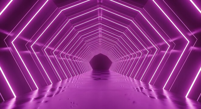 Immersive futuristic neon tunnel with repeating geometric shapes and vibrant purple and blue lighting effects