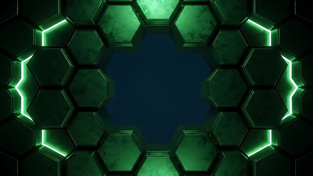 Futuristic green hexagon grid with neon glow & dark abstract background.