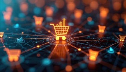 Glowing hub-and-spoke diagram connecting neon shopping carts, digital icons, upward graphs. E-commerce networks, digital retail ecosystem, online business trends, e-banking, cryptocurrency.