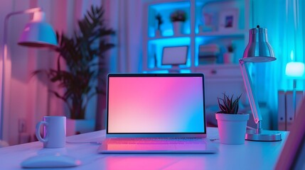 Modern laptop with vibrant gradient pink blue holographic color lights. Minimal office surrealism concept.