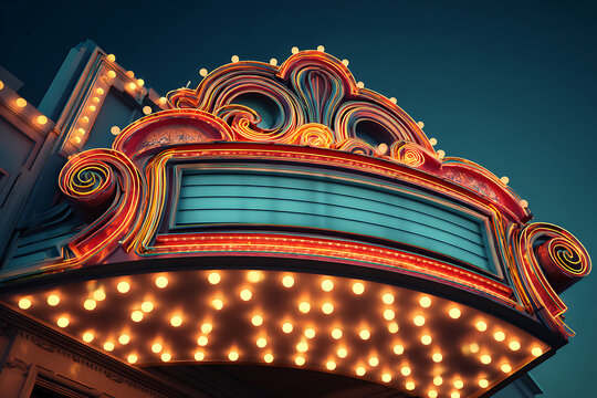 Blank Retro Theater Marquee with Ornate Details and Glowing Lights