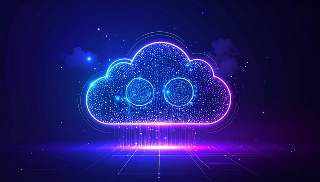 A glowing cloud formed of digital particles against a dark blue background, with light trails emanating from below