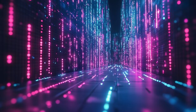 Abstract neon light streams with flowing binary code in cyberspace. Futuristic digital network, fast technology, secure communication, coding, innovation, modern design, vibrant colors, glowing energy