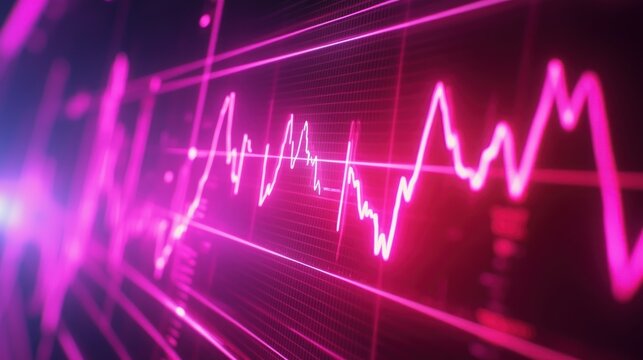 A pink and purple neon light on a black background with a line graph.