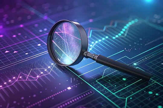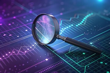 Data analysis concept with magnifying glass and graphs-Futuristic digital illustration showing a magnifying glass over glowing financial charts, symbolizing data analysis, research, and statistics.