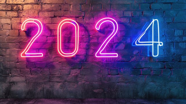 Number 2024, flickering red neon sign illuminates a vibrant blue wall, happy new year future is comming
