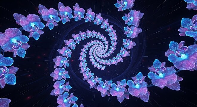 Enchanting floral vortex of orchids in neon hues creating a mesmerizing tunnel effect