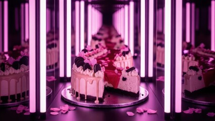 A decadent cheesecake, adorned with luscious pink frosting and delicate flower petals, sits amidst a mesmerizing tunnel of vibrant pink neon lights, creating a captivating and surreal dessertscape