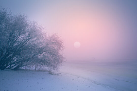 Winter landscape: frozen river bank covered with snow at sunrise. Panoramic photo with pink reflection of light on the ice surface.