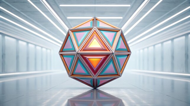 Futuristic translucent polyhedron with light patterns and gradient hues