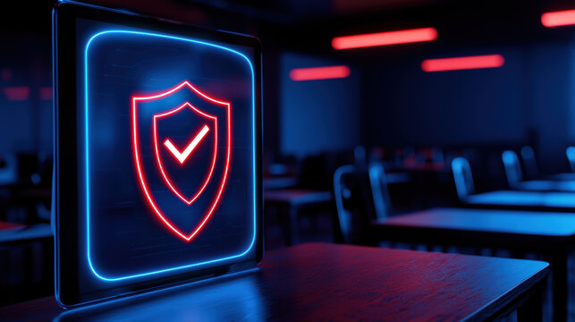 Cybersecurity firewall visualized as holographic data wall, dark background, neon blue accents