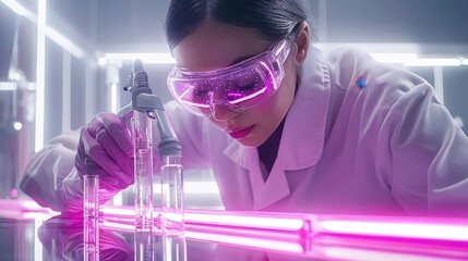 A focused scientist wearing protective eyewear conducts an experiment in a modern laboratory with glowing neon lights.