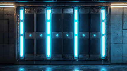 Futuristic sci fi door with glowing blue neon lights in a dark metallic corridor or spaceship interior