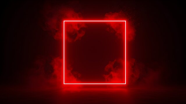 Glowing neon pink square with vibrant fog abstract background. Geometric fashion design. Empty minimal art decoration. A glowing neon square outline surrounded by colorful smoke in a dark setting.