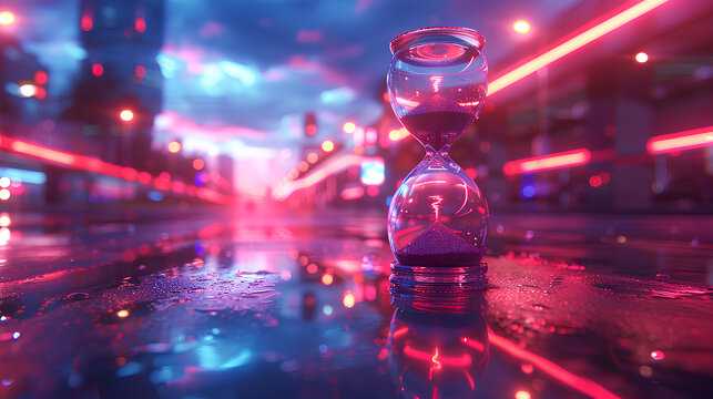 Futuristic luminous hourglass filled with swirling glowing particles. Neon blue and purple lights