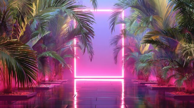 a pink neon frame with palm trees and a pink sky