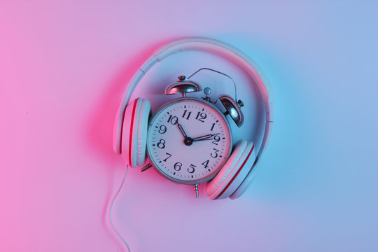 Illuminated alarm clock with glowing face and hands, dissipating into abstract shapes