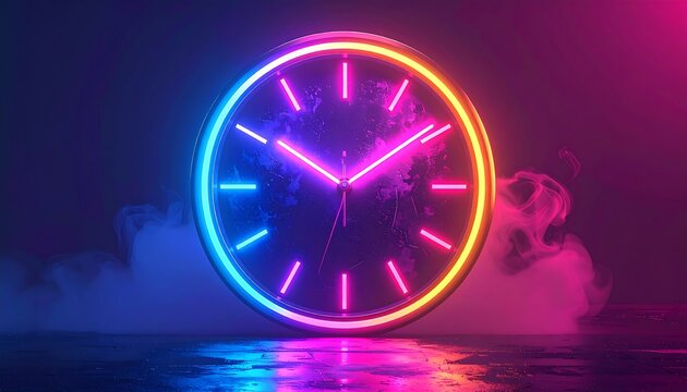 Neon Clock Countdown: A futuristic clock glows with vibrant neon colors against a dark background, its hands ticking towards a deadline or a new beginning.