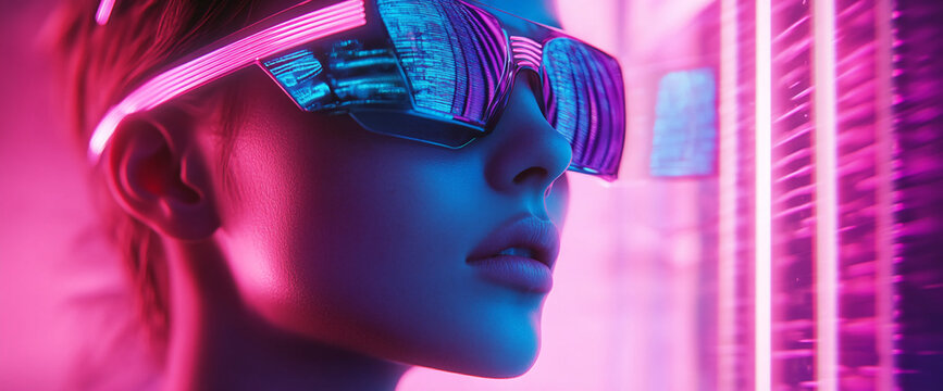 Close-up of woman's face wearing futuristic glasses, illuminated by pink and blue neon light, creating a vibrant and stylish image, showcasing modern fashion and technology