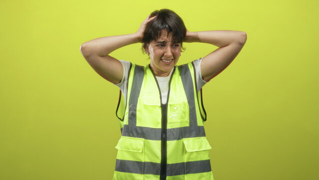 Young woman wearing fluorescent safety vest holding head with both hands against lime green backdrop in studio; frustration.