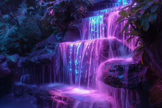 A cascading waterfall, illuminated by neon blue and pink lights, flows through a dark forest at night