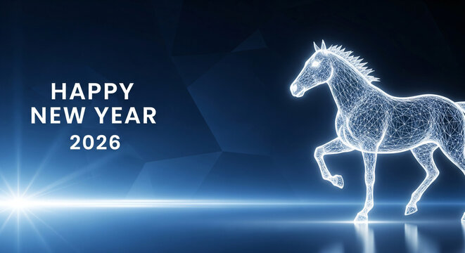 Happy New Year 2026 wireframe horse neon tech art futuristic celebration poster for