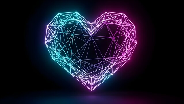 Stunning 3D wireframe human heart with vibrant neon blue and pink lighting against a stark black background, perfect for medical and science themes.