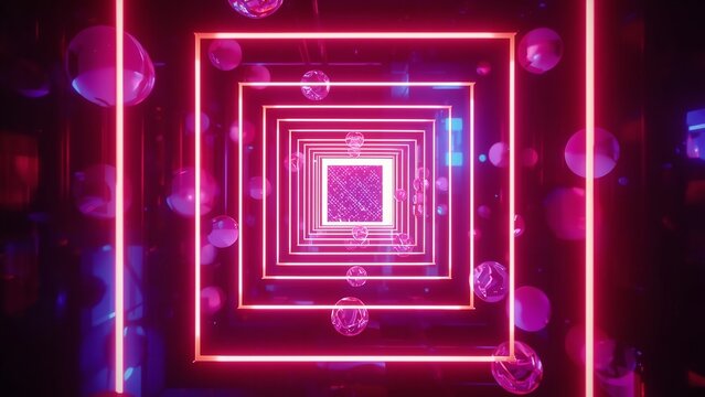 A vibrant pink neon square with glowing lines and orbs in a dark background